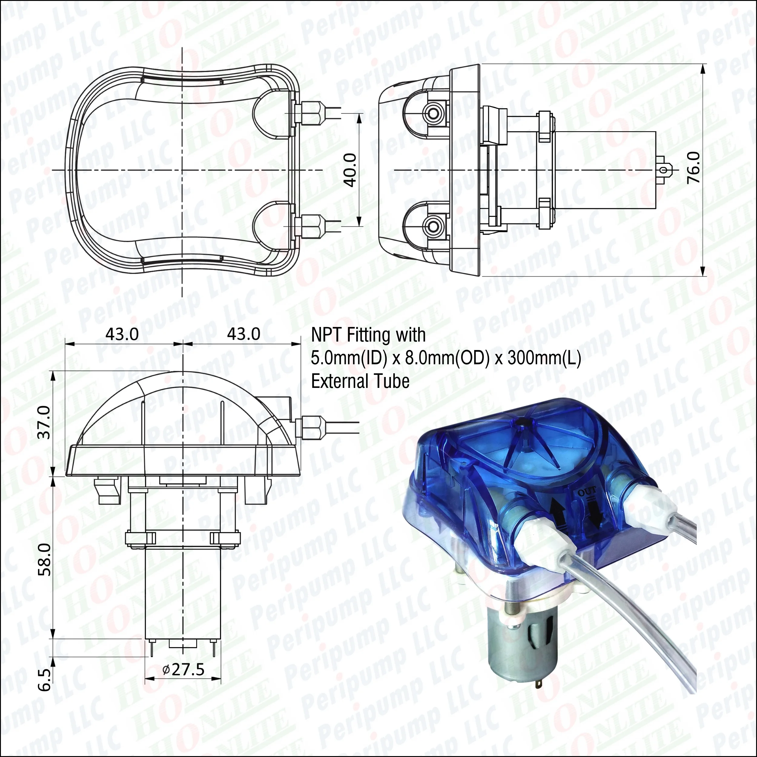500ml/min 2 rollers 24Vdc Honlite Peristaltic Pump with Exchangeable Pump Head and PharMed BPT Peri